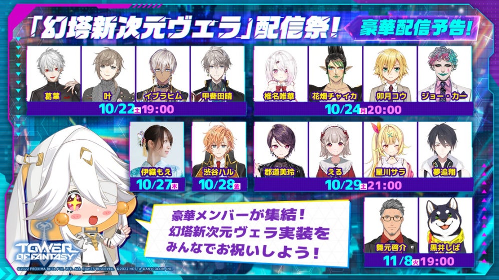 大型アップデートVer.2.0「ヴェラ」の実装を祝して、10月22日(土)より、『にじさんじ』の人気VTuberたちと豪華メンバーが集結した『「幻塔新次元ヴェラ」配信祭』が実施されます。