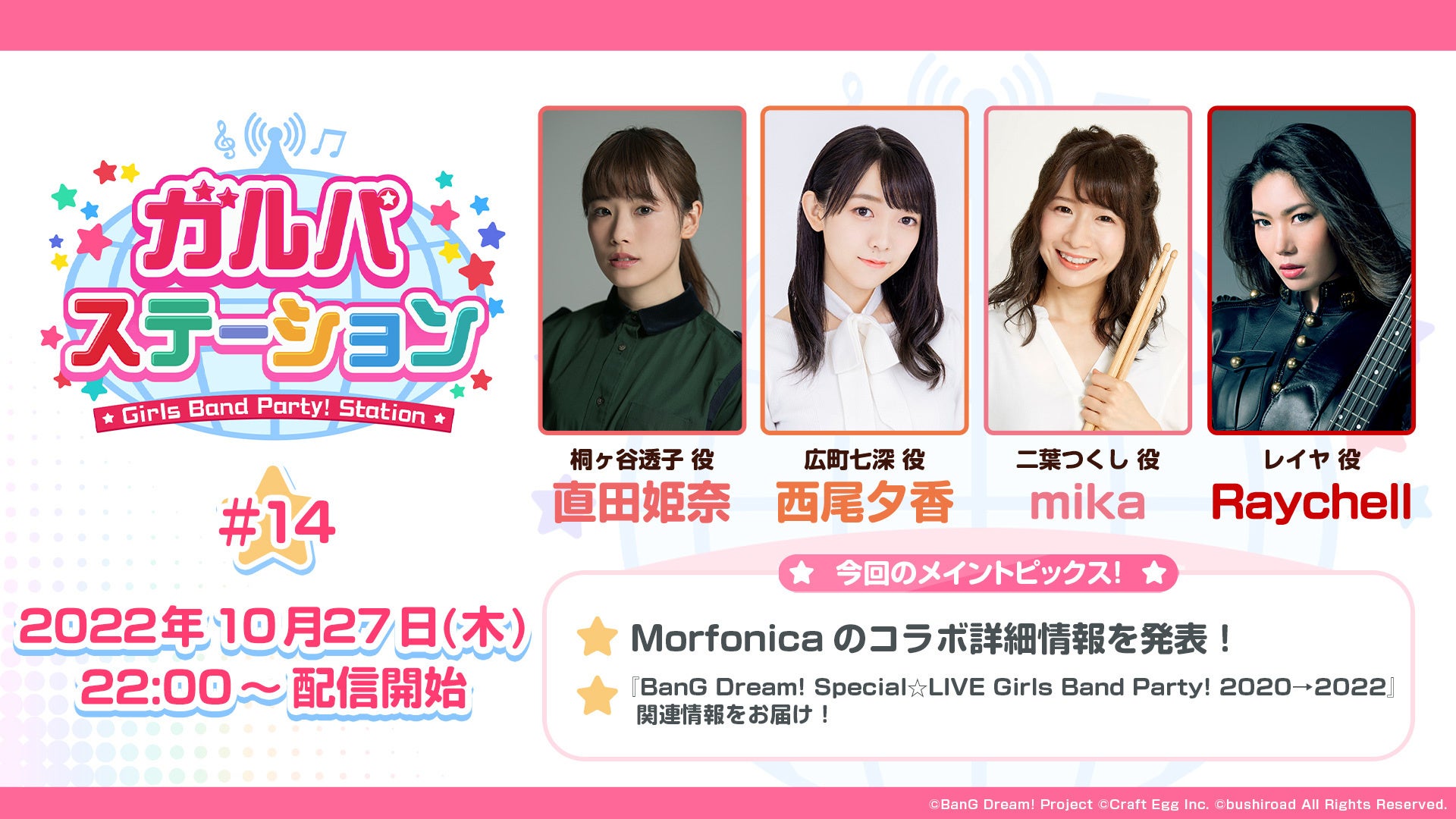 株式会社Craft Egg(本社:東京都渋谷区 代表取締役:森川 修一、以下、Craft Egg)と、株式会社ブシロード(本社:東京都中野区 代表取締役社長:木谷 高明、以下、ブシロード)の共同制作によるスマートフォン向けゲーム「バンドリ! ガールズバンドパーティ!」(以下、ガルパ)は、10月27日(木)22時より配信の「ガルパステーション #14」にて、10月下旬に開催を予定しているMorfonicaのコラボ詳細情報を発表いたします。また、「BanG Dream! Special☆LIVE Girls Band Party! 2020→2022」の関連情報などもお届けいたします。ぜひご覧ください。