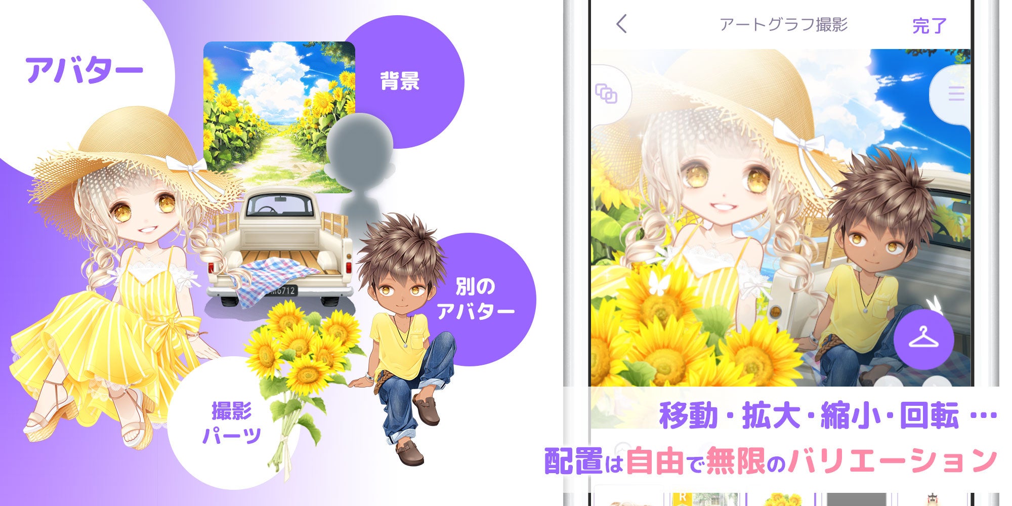 アバター着替えでコーディネートしたアバターを使って、背景・撮影用の雑貨などを配置する「アートグラフ」を投稿できます。配置したアバターとアイテムは移動、拡大、縮小、回転が自由自在!複数のアバターを同時に配置することもできるので、無限のバリエーションを生み出すことができます。
