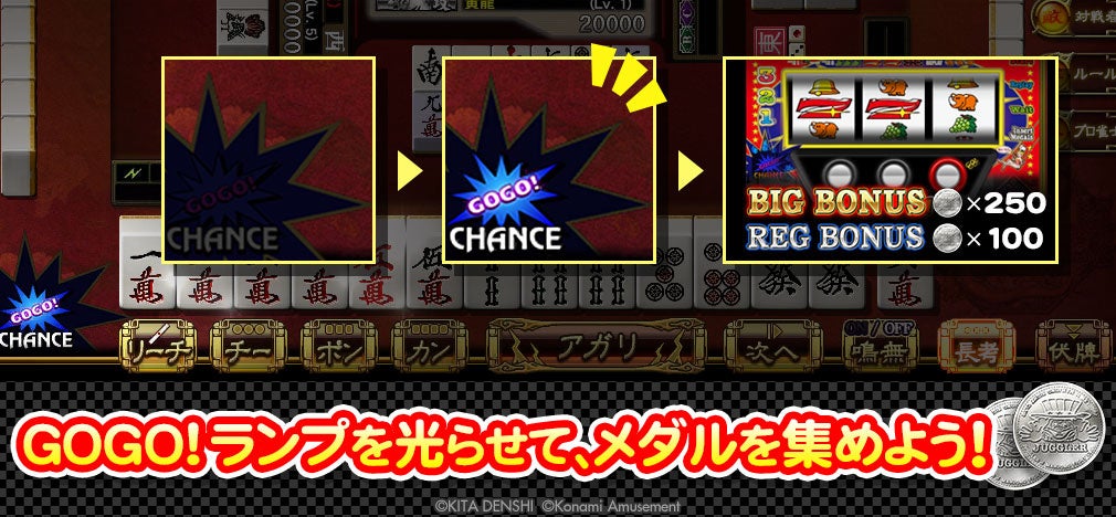 「GOGO!ランプ」を光らせるとメダルを獲得できます。獲得したメダルに応じて、BGM・リーチ演出・タッチ波紋など様々なゲーム演出をゲーム機で楽しめます!