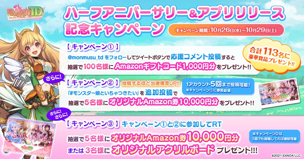 『モンスター娘TD』のハーフアニバーサリーおよび、App Store版/Google Play版の正式サービス開始を記念して、公式Twitterにてキャンペーンを開催!ツイートボタンからの投稿や、指定ハッシュタグでの投稿を行うと、Amazonギフトコードやオリジナルアクリルボードなど豪華賞品が当たります。