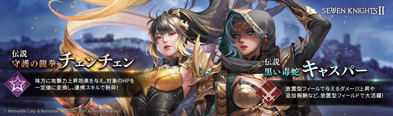 『セブンナイツ2』の世界に新たな伝説英雄として「黒い毒蛇 キャスパー(CV.行成とあ)」と「守護の龍拳 チェンチェン(CV.佐倉綾音)」が参戦いたします。