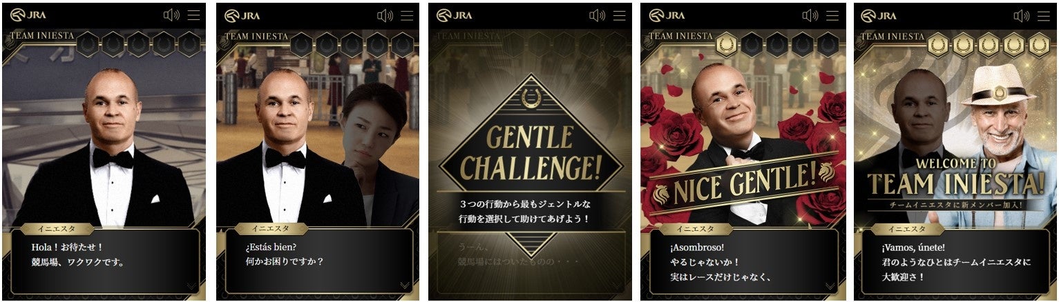 また、「イニエスタのジェントルケイバ」では、サッカー界きってのジェントルマンとしても有名なイニエスタ選手と競馬場を一緒に回り、偶然遭遇する競馬の楽しみ方が分からず困っている人を、ついついジェントルに救ってあげてしまうゲーム。ジェントルさをチェックしてくれるコンテンツであなたのジェントル度を測ってみてください。