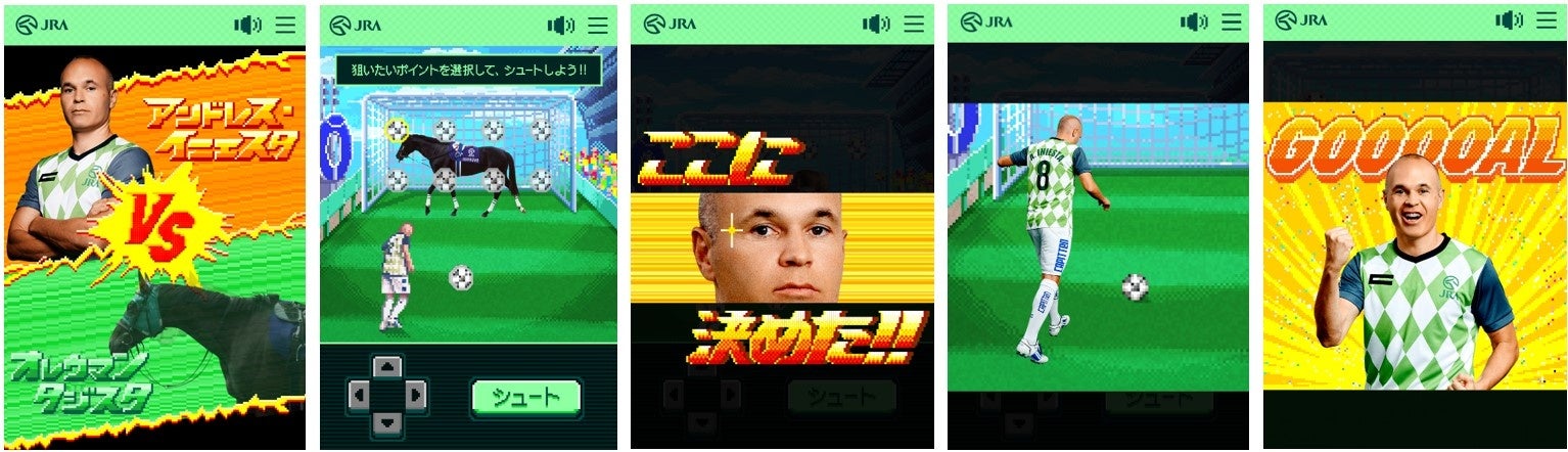 イニエスタ選手を操作して “ゴールキーパー”からゴールを決めるコンテンツ「イニエスタのファンタジスタPK」では、「サッカーにちなんだ馬名がついた実在のレジェンド競走馬」がゴールキーパーとなって登場。 鉄壁の守りを誇る競走馬との熱戦を制し、完全勝利を目指します。