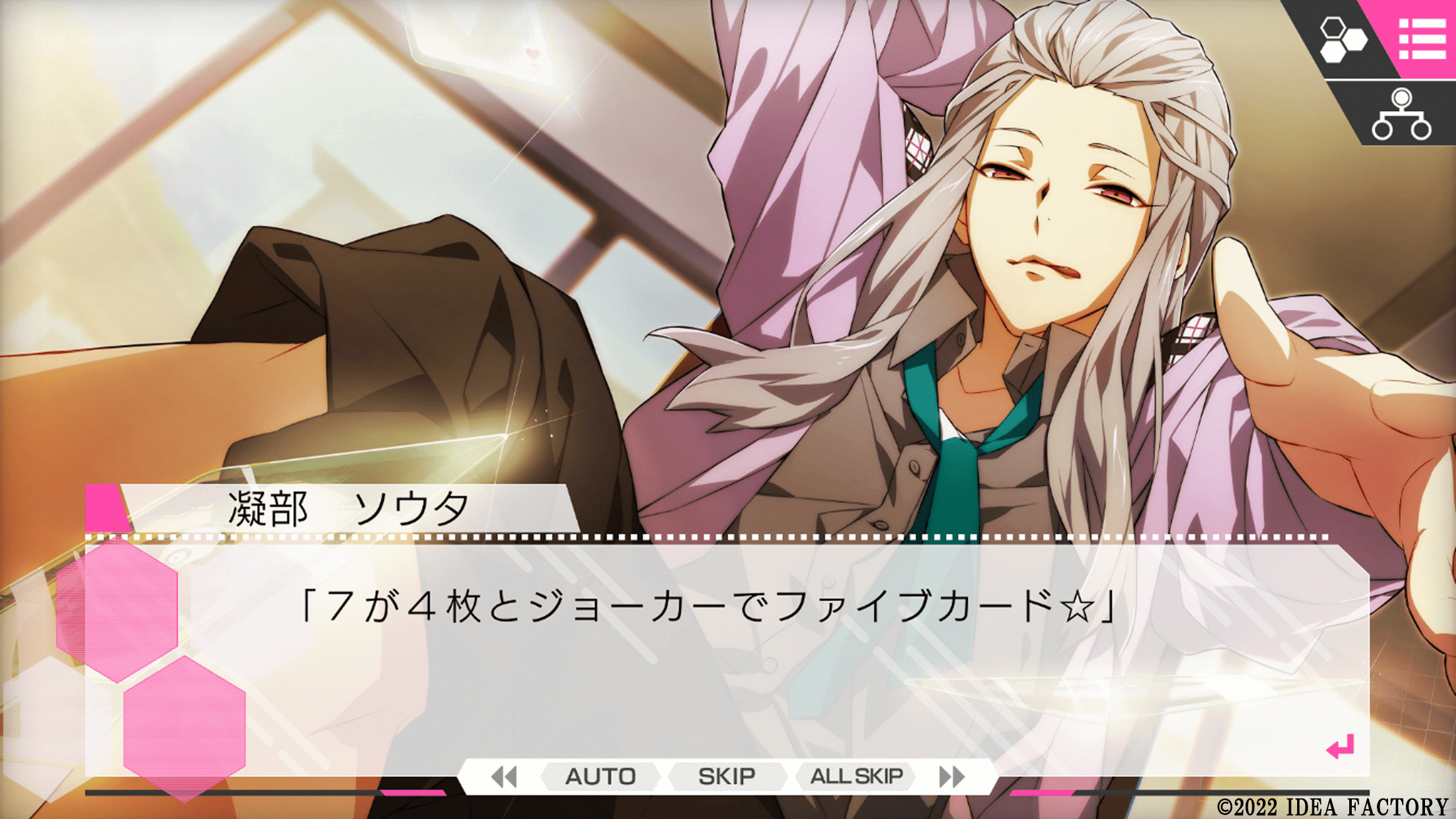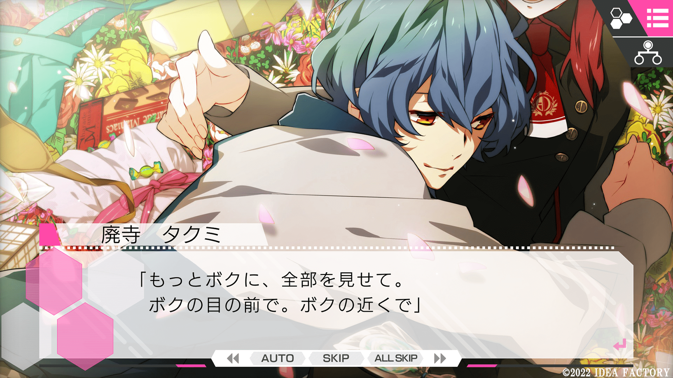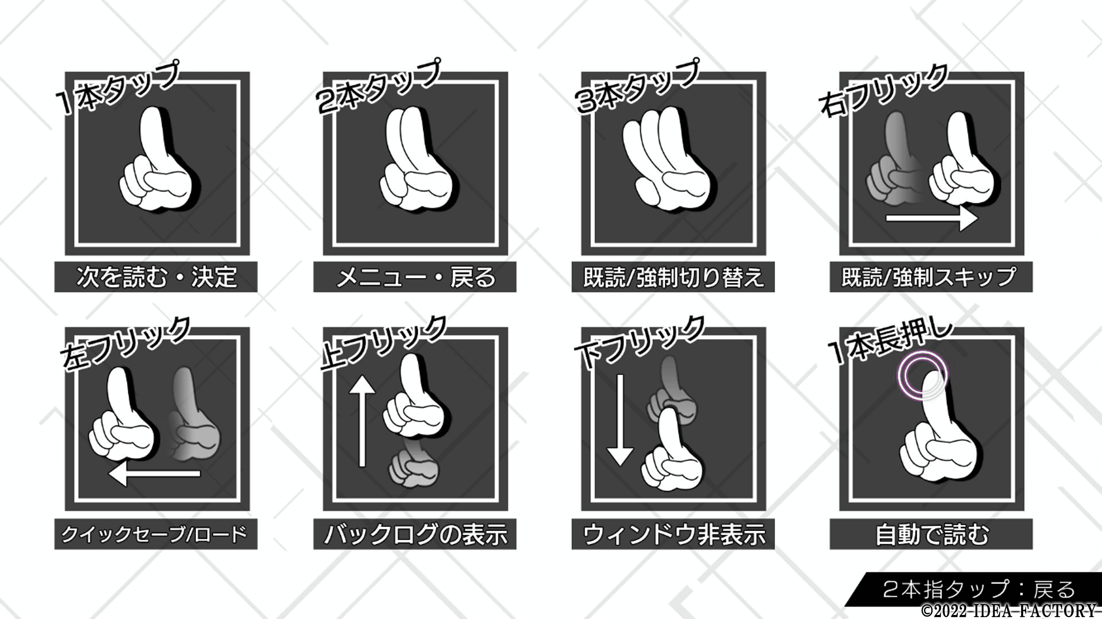 クイックセーブ、クイックロード、バックログ、既読スキップ、未読スキップ、オートモードなど快適にプレイできるシステムを搭載しています。