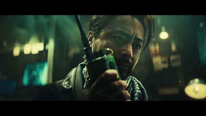 ミリタリーウェアに身を包んだ山田孝之さんが、さながら軍用シェルターと見まがうほど本格的に装飾された自宅部屋から、ベランダに飛び出し、軍用トランシーバーを使って街のプレイヤー達に呼びかけます。プレイヤー集団の先頭には、山田孝之さんの呼びかけに反応する貴島明日香さんの姿も。そして、山田さんが仲間たちに共闘することの大切さを熱く語ろうとしたその時・・・。