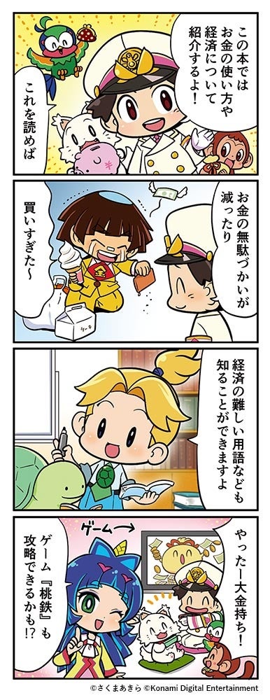 今回も、‟桃鉄‟と、学習参考書でおなじみの学研がコラボレーション! 本書では、ゲーム内で物件を購入したり、資産を増やしたりしていくなかで欠かせない知識「お金・経済のしくみ」について、100個のテーマを収録。お札や硬貨、キャッシュレス決済など子どもたちに身近なテーマだけでなく、銀行・物価・投資・賃金・税金・保険・年金など、子どもたちに今のうちから知っておいてほしいお金・経済のさまざまな知識を解説しています。楽しく学べる描きおろし4コママンガは、前作『47都道府県地理・歴史攻略』より収録数が50%以上増量。もちろん、学習のおさらいができるクイズページもついています。そのほかにも、前作以上にバラエティー豊富なおまけ要素がたくさん詰まった学習本です。