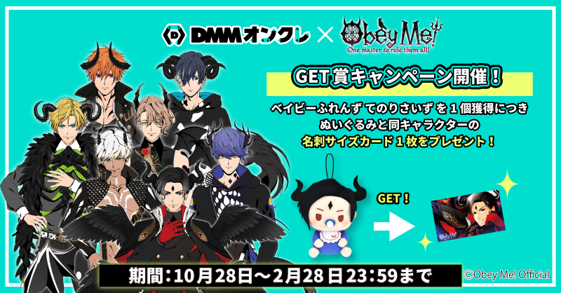 株式会社DMMオンクレ(本社:東京都港区、CEO:松縄貴重、以下、DMMオンクレ)」は、2022年10月28日(金)より、女性向けアプリゲーム「Obey Me!」の、DMMオンクレでしか手に入らない限定景品(プライズ)を展開及び、GET賞キャンペーンを開催いたします。