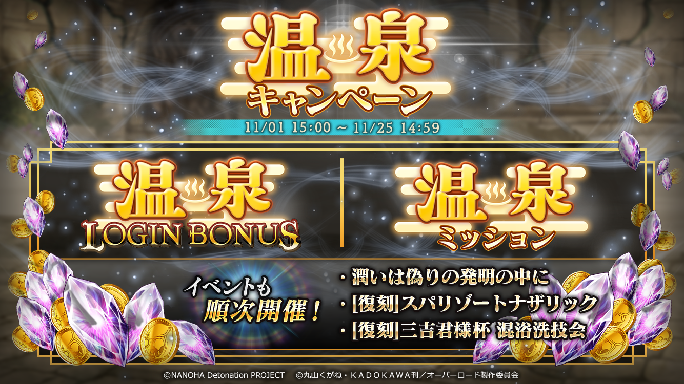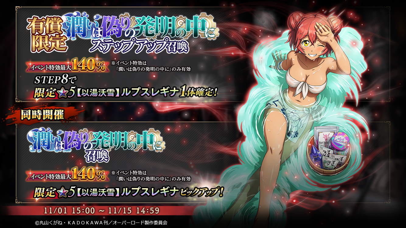 11/1より新規イベント『潤いは偽りの発明の中に』を開催いたします!イベント連動召喚では『★5【以湯沃雪】ルプスレギナ』が新登場!さらに、温泉キャンペーンとして復刻イベントの開催や、過去の★5キャラクターも復刻登場!