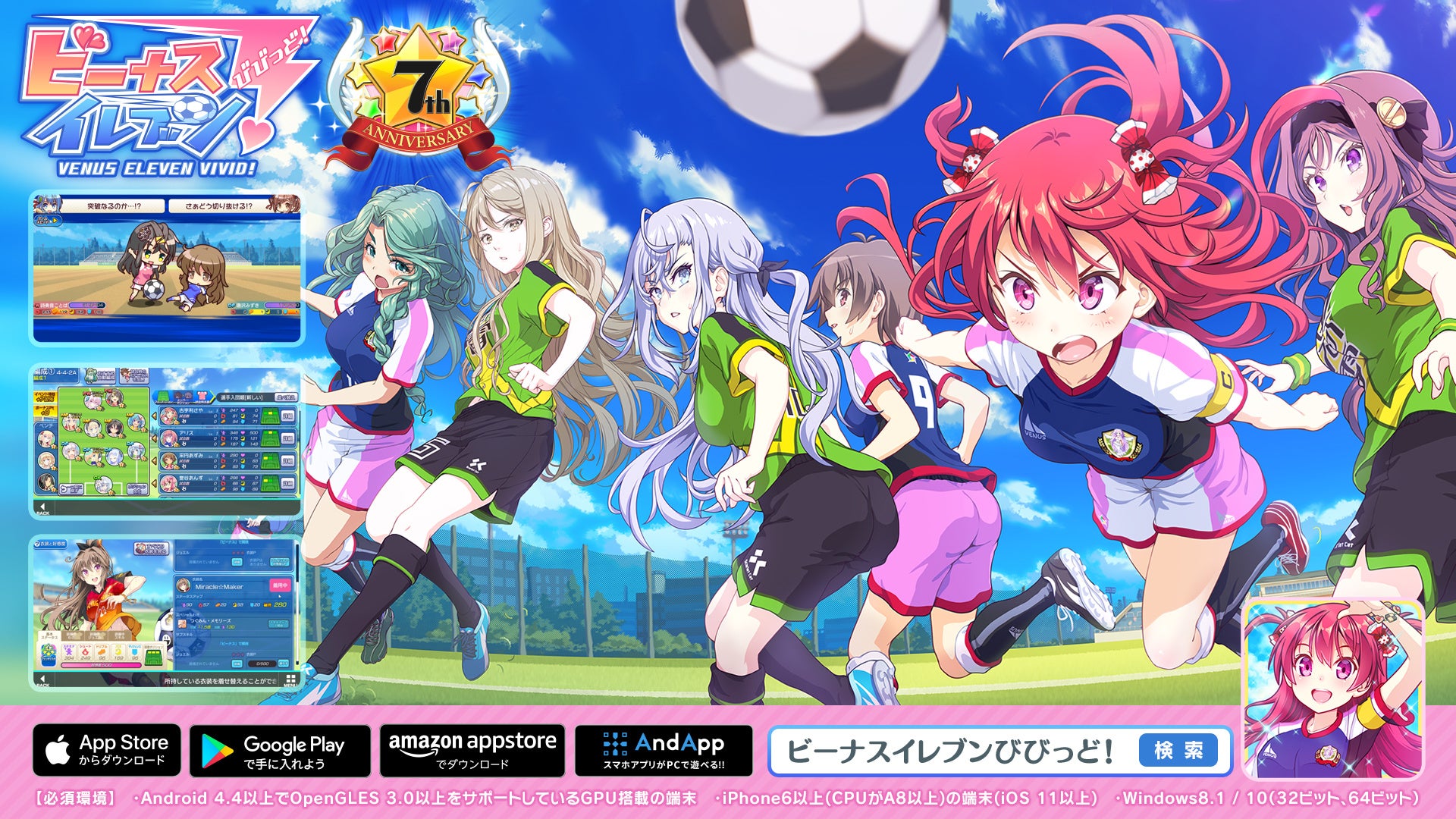 株式会社アメージングのiPhone,Android用アプリ、美少女育成サッカーシミュレーションゲーム『ビーナスイレブンびびっど!』(略称:びびび)は、2022年11月4日で「Android版サービスイン7周年」を迎え、11月18日には「iOS版サービスイン7周年」を迎えます。