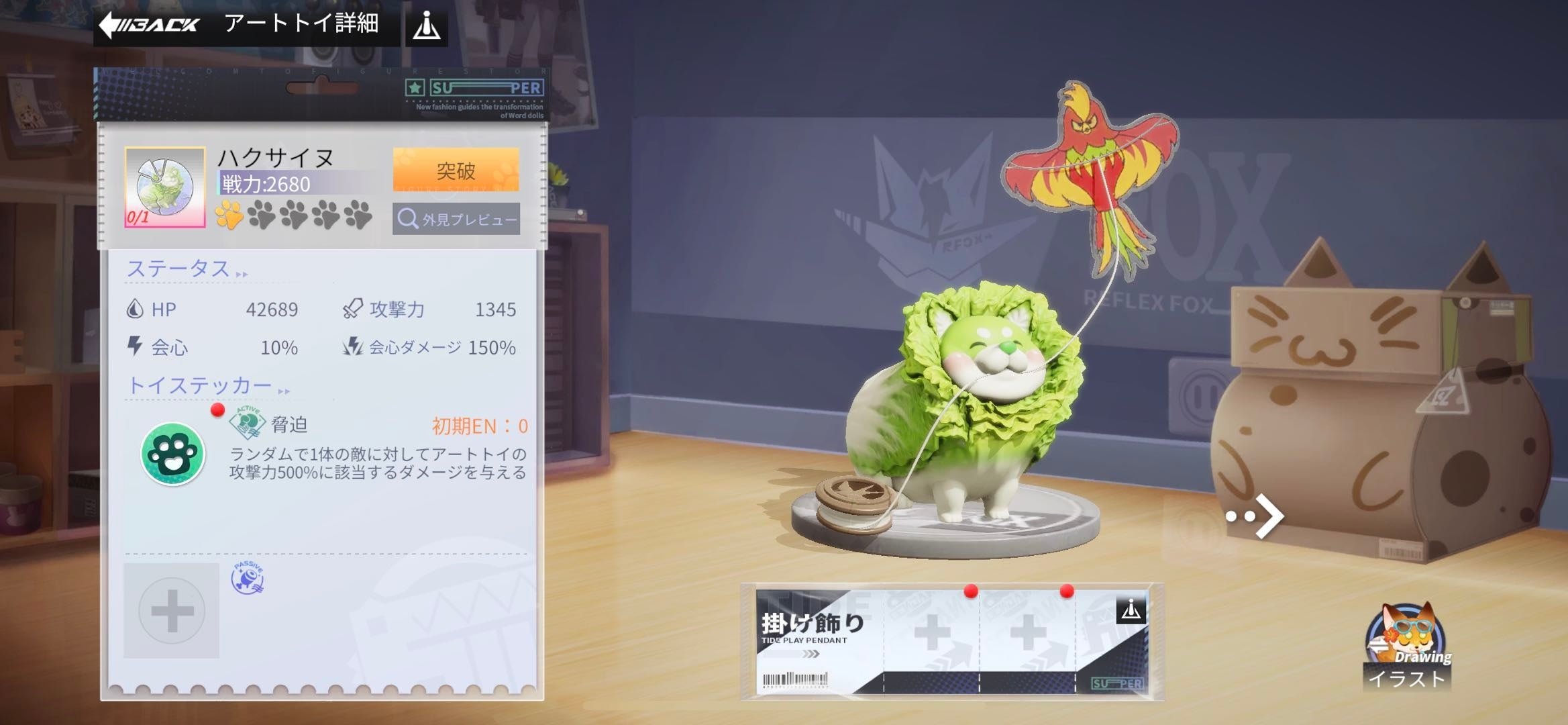 イラストレーター・ぽん吉氏による可愛くて不思議なキャラクター「おやさい妖精さん」「果物妖精さん」シリーズから、白菜犬の「ハクサイヌ」がゲーム内に登場予定!フィギュアの仲間として戦闘時にサポートしてくれる“アートトイ”として実装いたします。10月30日(日)よりコラボ事前イベントとして「オールスター」に登場、11月6日(日)からはログインボーナスやアクティブミッション、他コラボイベントに登場いたします。詳細はゲーム内でご確認くださいませ。