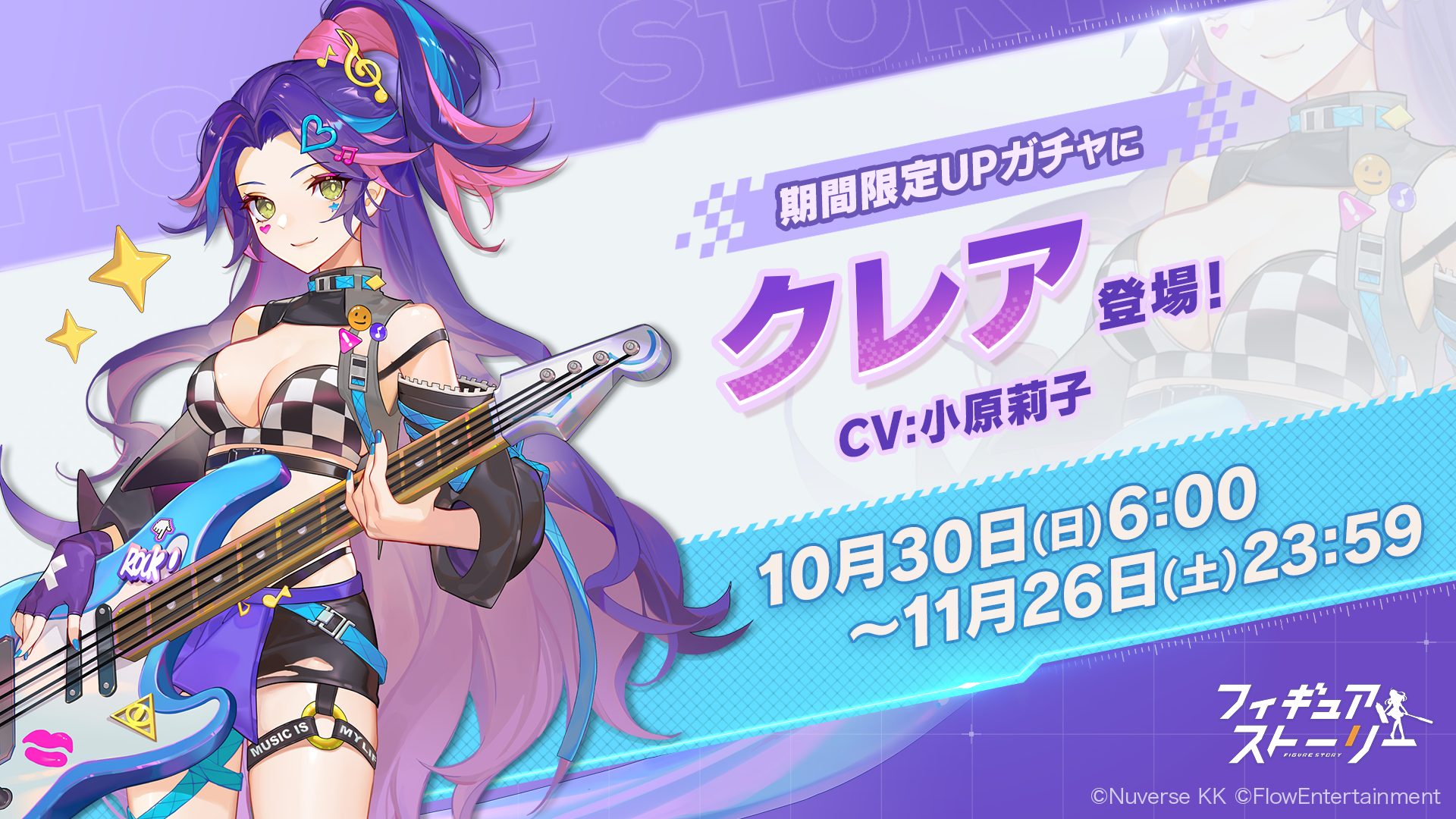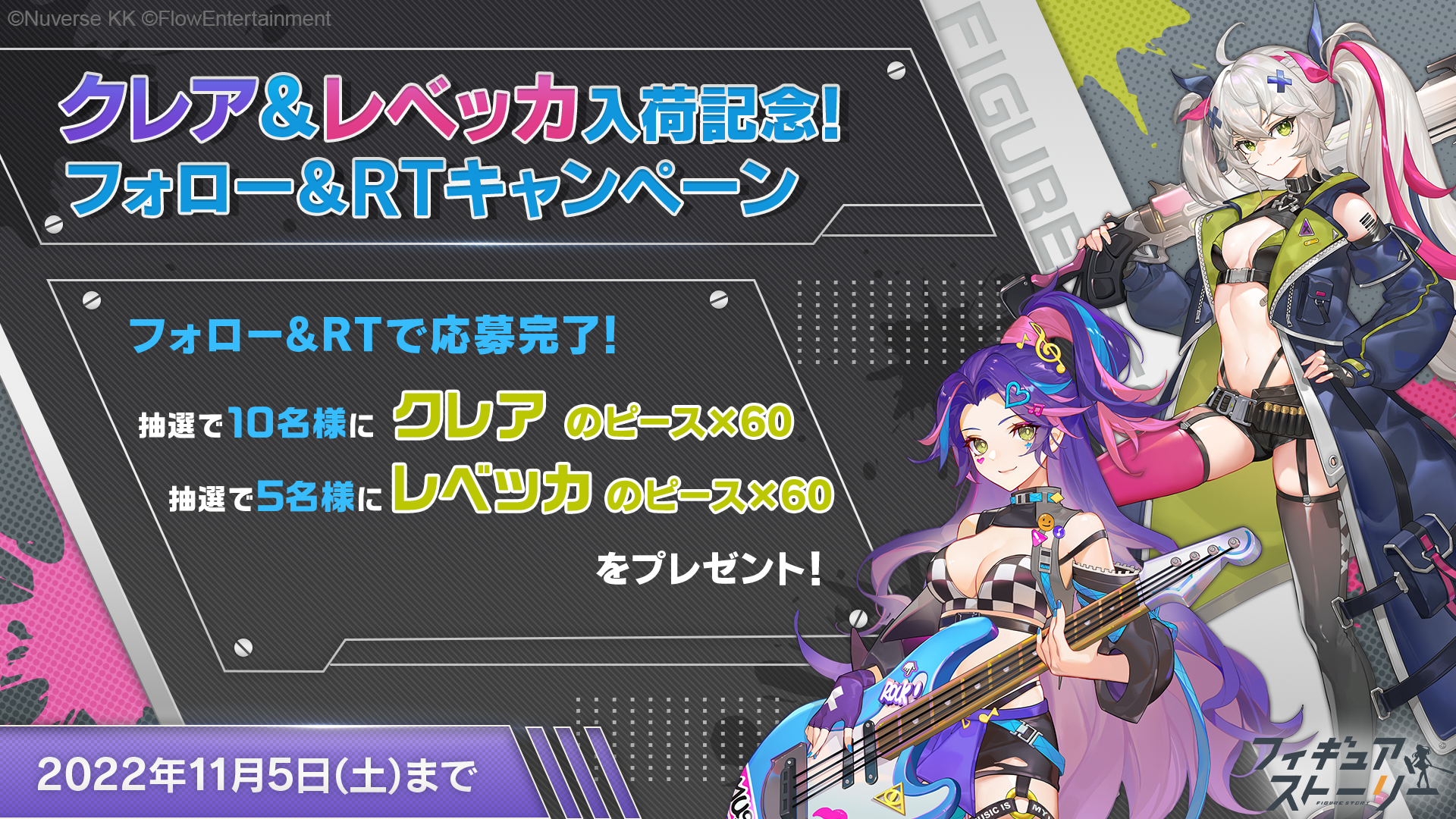 Nuverse株式会社は、運営するスマートフォン向け“フィギュアRPG”『フィギュアストーリー(以下ギアスト)』において、10月30日(日)に新フィギュア(キャラクター)の「クレア(CV:小原莉子)」と「レベッカ(CV:佐伯伊織)」、および関連するシナリオイベントを実装いたしました。また、11月6日(日)には「おやさい妖精さん」「果物妖精さん」とコラボレーションした、新たなアートトイ(サポートキャラ)を実装いたします。さらに新フィギュアの実装を記念し、クレアやレベッカのフィギュアピースが抽選で当たるTwitterキャンペーンを行います。