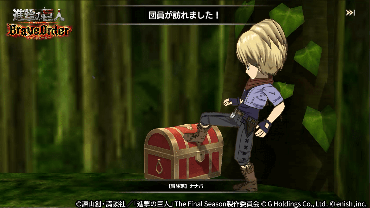 株式会社enish(本社:東京都港区、代表取締役社長:安徳 孝平、以下enish)は、アニメ『進撃の巨人』のスマートフォンゲーム最新作「進撃の巨人Brave Order」にて、10月31日(月)より新イベント「伝説の冒険家」を開催!イベントアイテムを集めて限定の「ライナーの衣装」を手に入れよう!また、本日より新登場の【冒険家】エレン・イェーガー、【冒険家】ミケ・ザカリアス、【冒険家】ナナバがピックアップされた「伝説の冒険家ガチャ」も同時開催!その他、最新情報はゲーム公式サイト・ゲーム公式Twitterアカウントにて随時公開して行きますので、ぜひご覧ください。