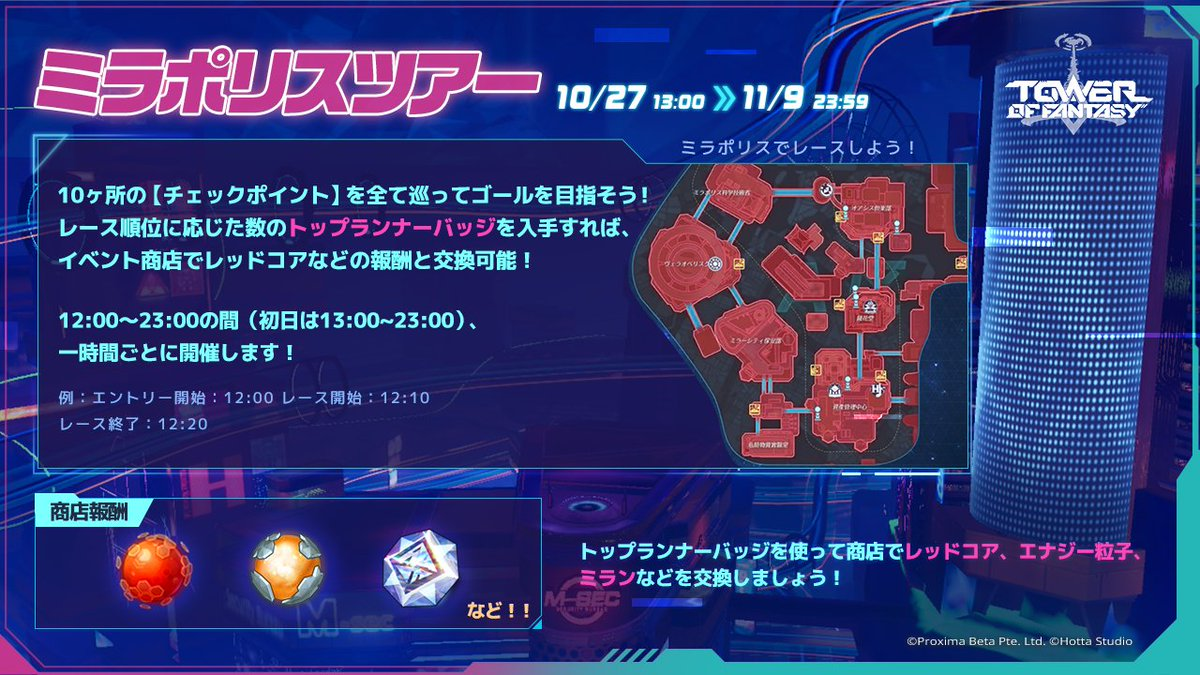 Ver.2.0「ヴェラ」を記念したスペシャルキャンペーンの「ミラポリススアー」をただいま開催中です。キャンペーン期間内は、毎日指定時間内に「ヴェラ」の新エリア「ミラポリス」で指定された10ヶ所のチェックポイントを巡ることで、順位に応じたトップランナーバッジを手に入れて、超レアな「レッドコア」を含む超豪華報酬と交換することができます。キャンペーン詳細はゲーム内でご確認ください。