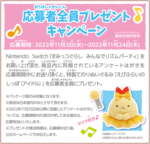 ゲームに登場するアイドルコスチュームの「えびふらいのしっぽ」の、とってもかわいいてのりぬいぐるみがもらえるチャンスです!ぜひ、応募期間内(2022年11月2日水曜日~2022年11月24日木曜日:最終日消印有効)にお買い求めいただき、奮ってご応募してください︕