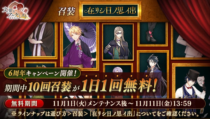 合同会社EXNOA(本社:東京都港区、CEO:村中 悠介、URL:https://games.dmm.com/)が運営するDMM GAMESは、11月1日(火)より、女性向け文豪転生シミュレーションゲーム「文豪とアルケミスト」において、6周年を記念した各種キャンペーンを開始いたしました。
