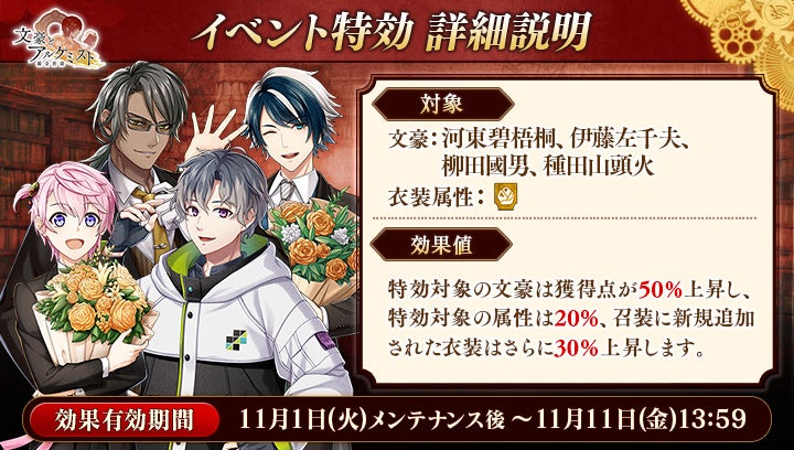さらに、イベントと同時に開催される限定召装『特別要請-前編-「種田山頭火ヲ救出セヨ」』にて新規追加された「河東碧梧桐」「伊藤左千夫」「柳田國男」の〈正装衣装〉を編成すると、得点の獲得率がそれぞれ30%上昇します。