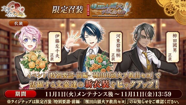 文豪の「衣装」や、会派に装備する事で能力を強化できる「装像」などが入手できるコンテンツ「召装」に、限定召装『特別要請-前編-「種田山頭火ヲ救出セヨ」』が期間限定で登場します。この召装では、イベント『特別要請-前編-「種田山頭火ヲ救出セヨ」』で活躍する「伊藤左千夫」「河東碧梧桐」「柳田國男」の新衣装を一定の確率で入手できます。