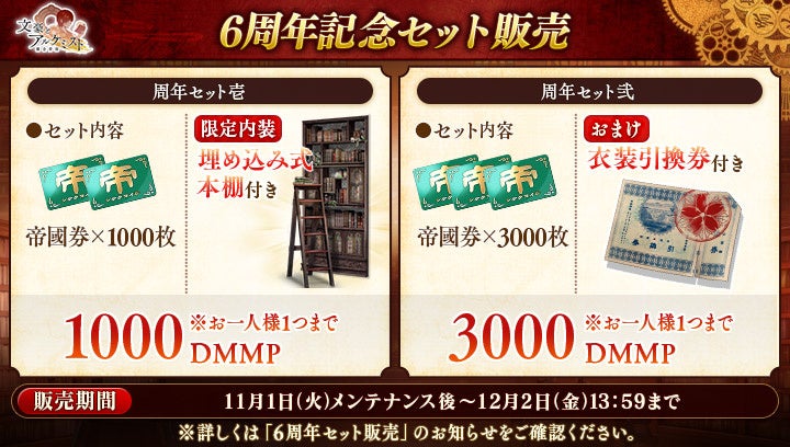 記念内装「埋め込み式本棚」と帝國券が含まれている「周年セット壱」と、衣装引換券と帝國券が含まれている「周年セット弐」がそれぞれ登場いたします。