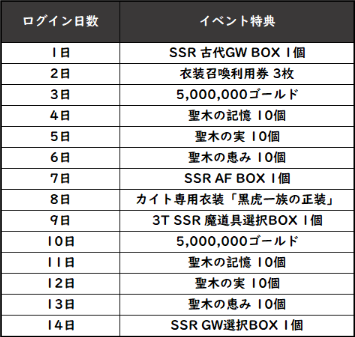 強大な力を秘めた古代グランウェポンがランダムで入手できる「SSR古代グランウェポンBOX」の他、「SSR 魔道具選択BOX」「SSR グランウェポン選択BOX」「カイト専用衣装 黒虎一族の正装」など、豪華な内容となっております!欠かさずログインして豪華報酬をゲットしましょう!