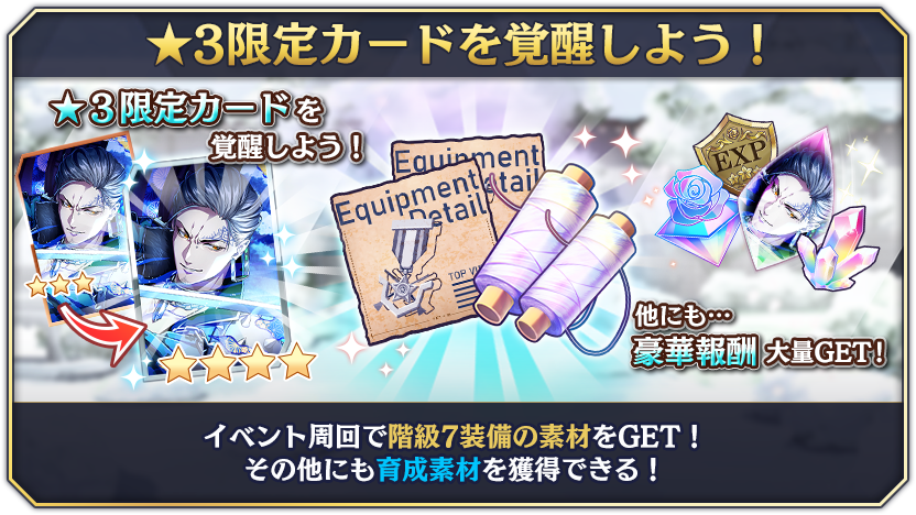★3以上のカードには、固有の『カードストーリー』が付き、★4に覚醒することでイラストがLive2Dに変化します!また、★3「【紅血吸いたる妖刀】ジーグブルート」をメインカードに編成すると、現在開催中のイベントで特攻効果が発動します!是非お迎えしてイベントを有利に進めましょう!