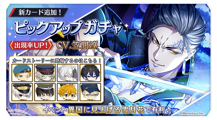 株式会社マーベラス(代表取締役社長:佐藤 澄宣/所在地:東京都品川区)による、スマートフォンゲーム『千銃士:Rhodoknight』(読み:せんじゅうし ろーどないと 以降、『千銃士R』)は、本日よりストーリーイベント「異国に見上げる雪月花」を開催いたします。本イベントではイベント限定ストーリーが読める他、イベント内の引換所でここでしか手に入らないイベント限定家具が獲得できます!イベントにあわせて、イベント内で活躍する★3「ジーグブルート(CV:笠間淳)」の新カードがピックアップで登場する期間限定ガチャを開催いたします。