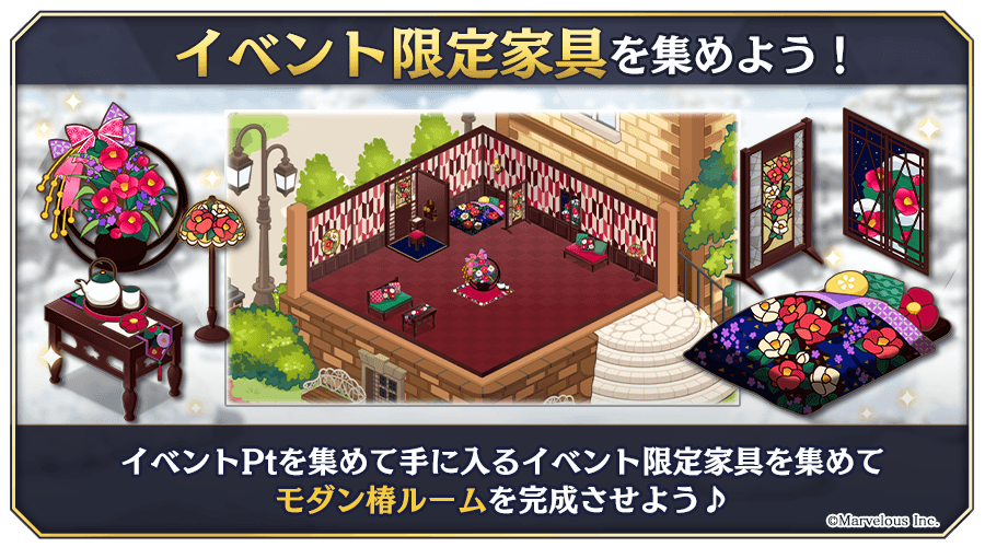 今回のイベントでは「モダン椿ルーム家具」がイベントPt報酬で入手可能!