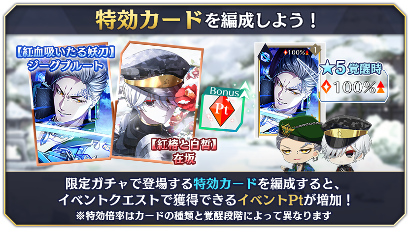 ※★3「【紅血吸いたる妖刀】ジーグブルート」は2022/11/3より、★3「【紅椿と白皙】在坂」は2022/11/8より開催のピックアップガチャから出現します。本イベントの報酬では獲得できませんので、あらかじめご了承ください。