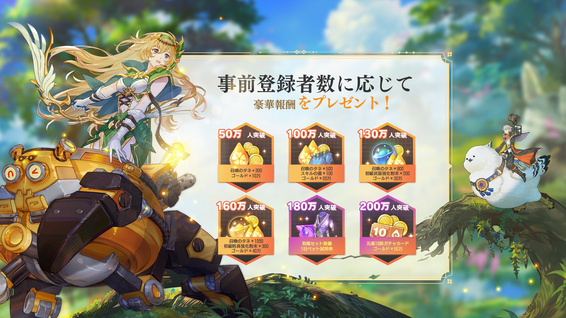 事前登録者数の目標達成に応じて、正式リリース後に配布されるゲーム内報酬が変わる記念キャンペーンを同時に開催しています。すでに50万人達成で、「召喚のタネ300個」と「ゴールド10万」プレゼントは確実!最初のアイテムが充実しているほど、ゲームはもっと面白くなる!