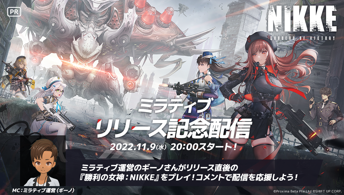 さらに、「ミラティブ」運営による「『勝利の女神:NIKKE』リリース記念配信 」も11月9日(水)夜20時〜より実施する予定です。「ミラティブ」運営のギーノさんが登場し、ゲームを実際にプレイしながらその魅力や遊び方を分かりやすく解説していただきます。ぜひ、ご視聴ください。
