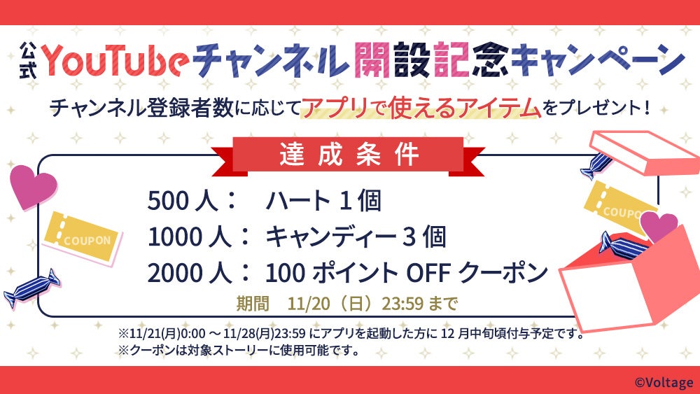 また、チャンネル開設を記念して、100恋+内で使用できるアイテムのプレゼントキャンペーンを実施しております。登録者数に応じてもらえるアイテムが豪華になりますので、この機会にぜひYouTubeとアプリで「100恋+」をお楽しみください。