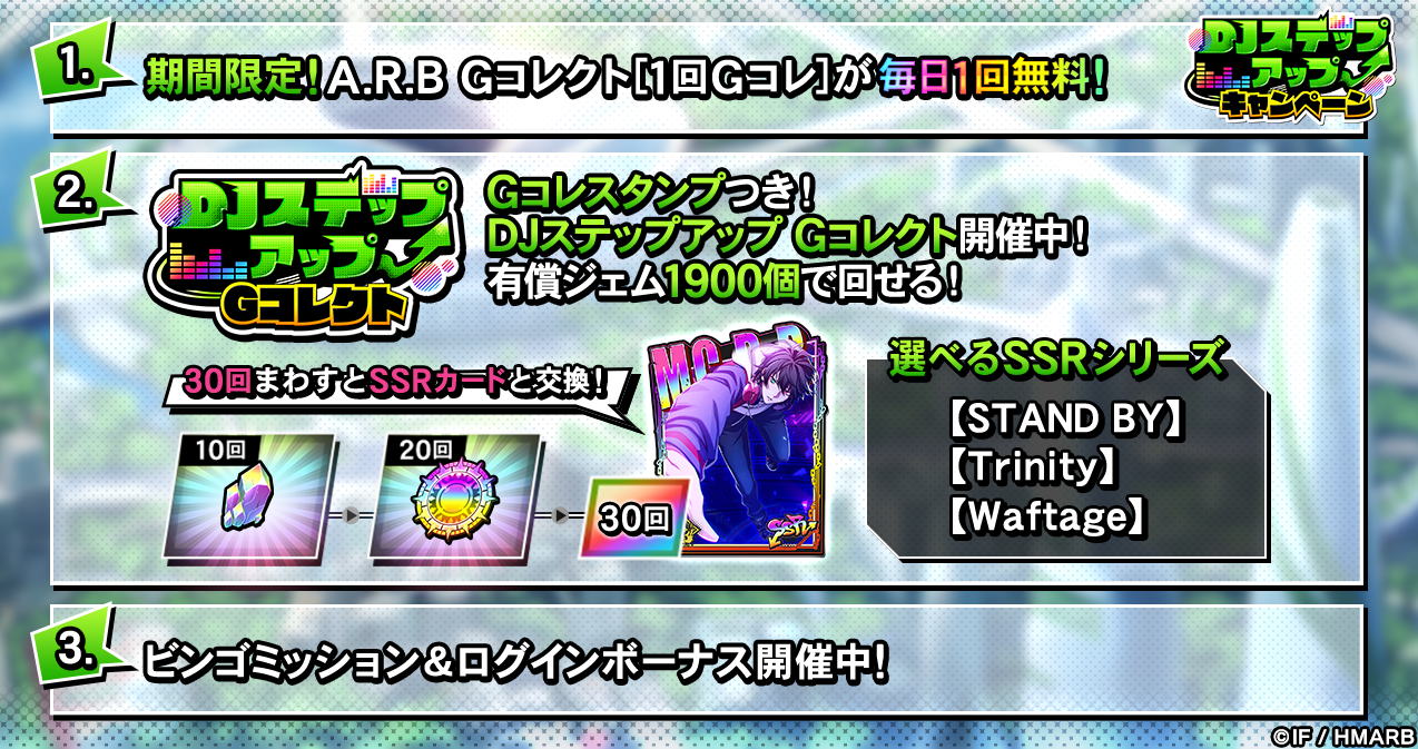 期間中A.R.B Gコレクトの[1回Gコレ]を1日1回、無料で回すことができるほかに、ビンゴミッションやログインボーナス、オートプレイ1日2回消費無料キャンペーンなどを開催しています。詳細はアプリ内お知らせをご確認ください。