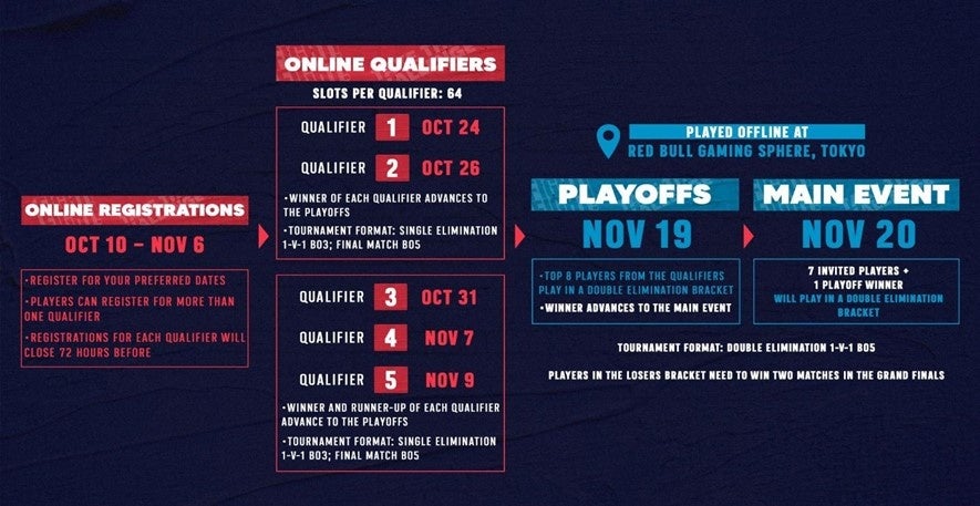 本大会は2022年11月19日(土)から20日(日)にかけて、Red Bull Gaming Sphere Tokyo(レッドブル・ゲーミング・スフィア・トーキョー/東京都中野区)で開催されます。またファンの皆様は、ONE Esports の大会公式サイト (https://www.oneesports.gg/tokyo-invitational-jp/) 、およびONE Esportsの公式SNS にて、日本語と英語によるイベントのライブ放送を無料でお楽しみいただけます。本大会では、10月より実施しているオンライン予選を突破した上位8名とchikurinやBookなどの著名招待プレイヤー7名が出場し、賞金総額2万米ドル (約300万円)をかけて技を競い合います。