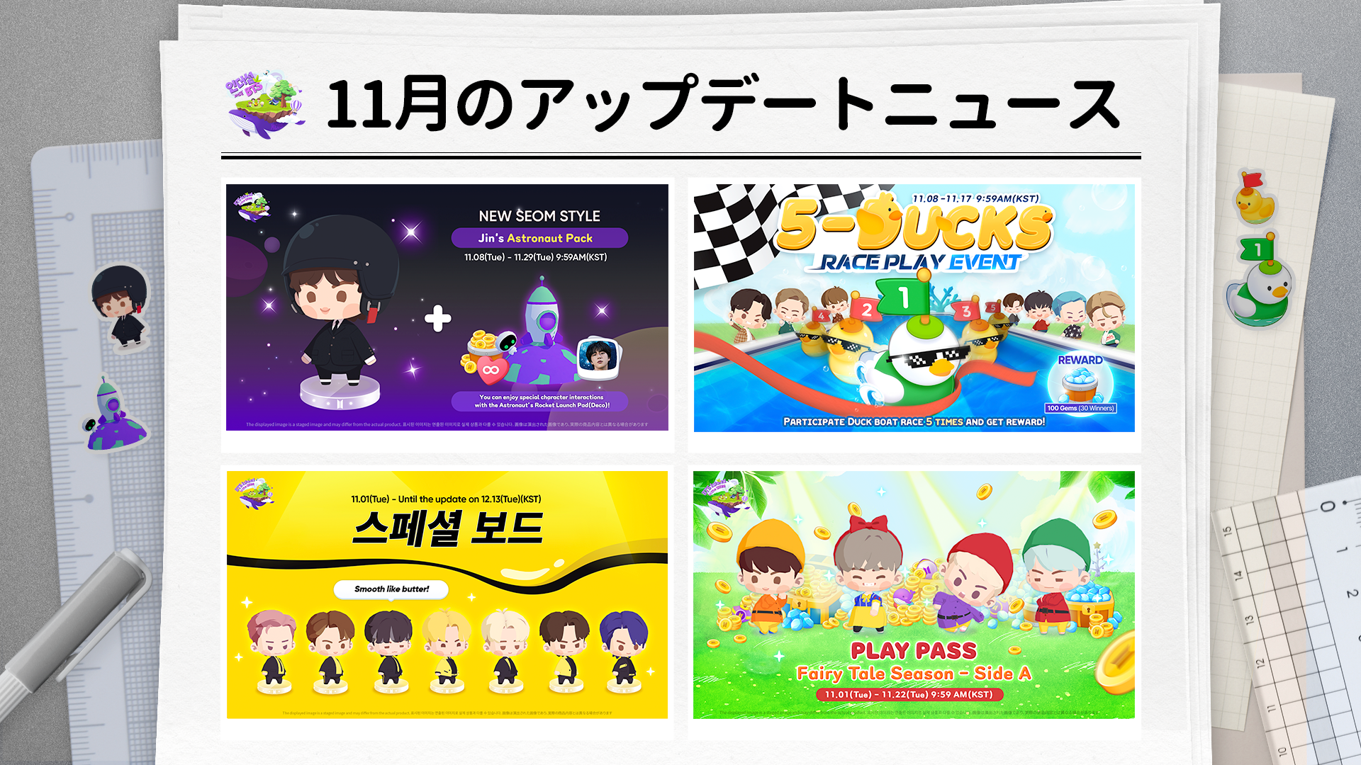その他にも、BTS JINのソロシングル「The Astronaut」の発売を記念してミュージックビデオの中の衣装をモチーフにしたコスチュームと宇宙船デコなどの新しいアイテムも公開しました。また、「BTS」というテーマでショートストーリーを募り、ゲーム内のプッシュメッセージを通じて心温まるエピソードをユーザー同士で交わすことができるイベントも準備しており、ユーザーに新たな楽しみを提供します。