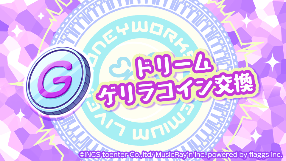本日11月8日(火)より、ゲリラライブ専用楽曲をクリアすることで手に入る「ドリームゲリラコイン」を、好きな進化アイテムや応援アイテムと交換することができる『ドリームゲリラコイン交換所』を開催いたします。この機会にぜひ交換所をご利用ください。