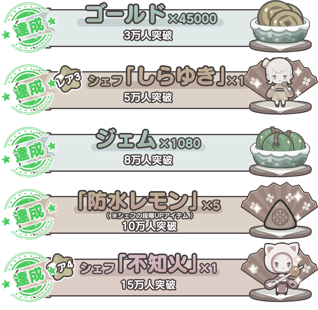 ・【達成】15万人突破レア4:シェフ「不知火」1名