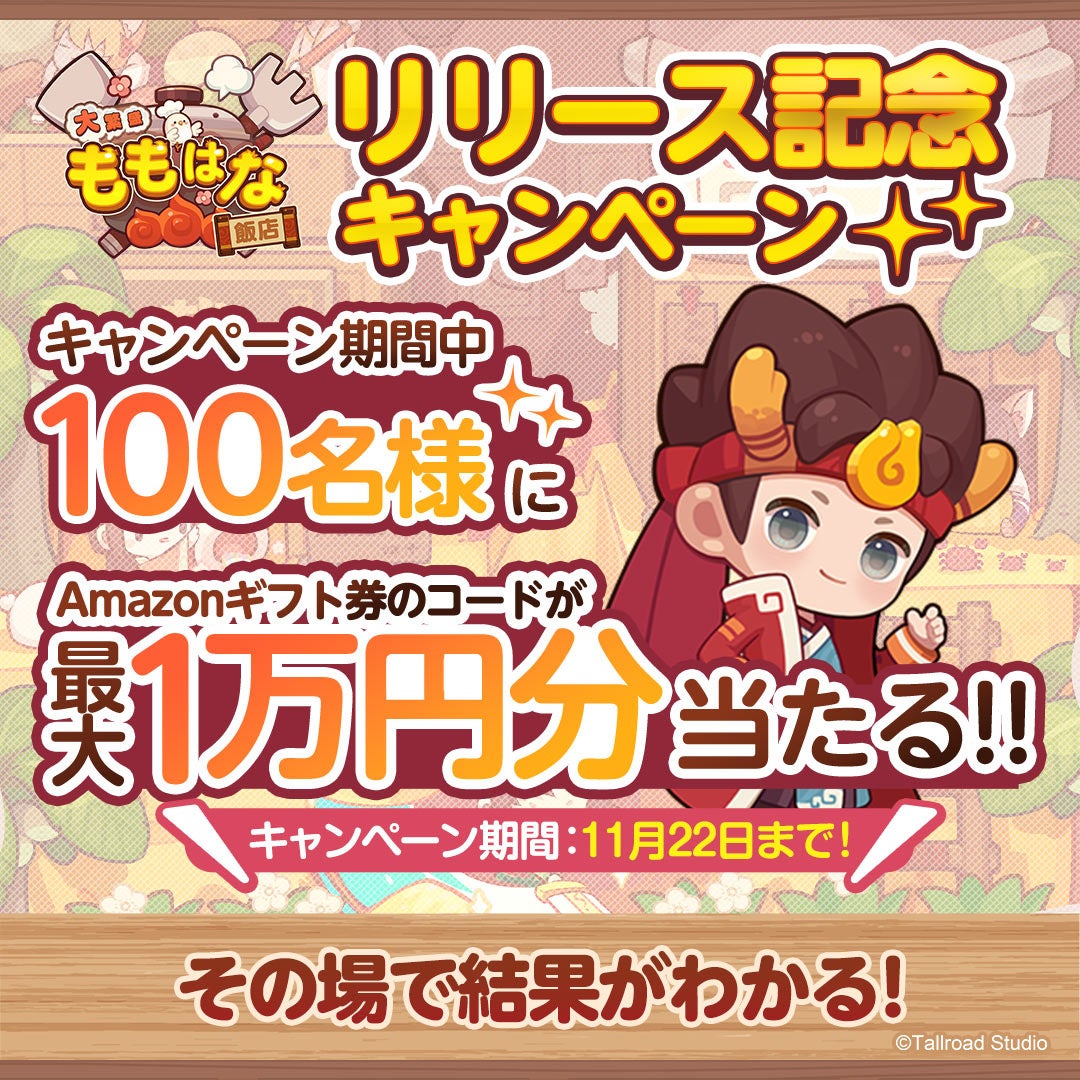 「大繁盛!ももはな飯店」の正式サービス開始に伴い、期間中100名様にAmazonギフト券のコードが最大1万円分当たるキャンペーンを開催いたします。