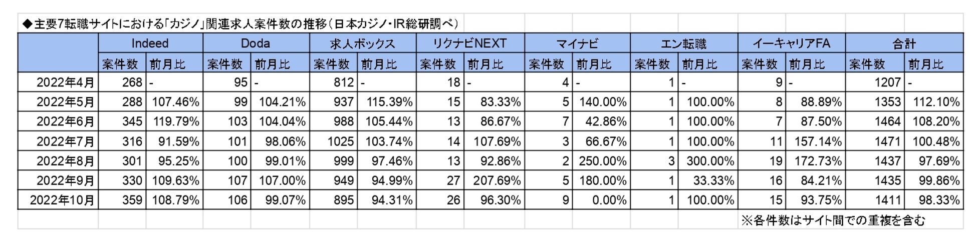 グローバルデジタルマーケティング企業のWindstorm Media Communications Ltd.(以下、当社)が運営する日本のカジノ・IR(統合リゾート)領域に特化したニュースメディア『日本カジノ・IR総研』(https://casino-tengoku.com/lab/)は、日本国内における日本カジノ・IR関連求人数の最新調査(2022年10月時点)をまとめましたので、結果を発表いたします。