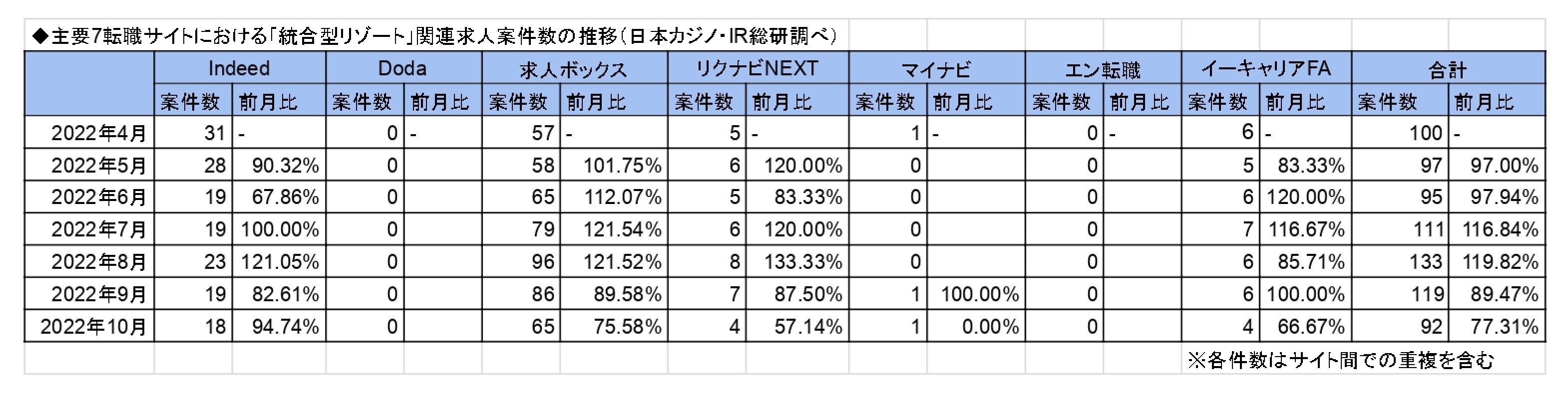 主要転職7サイト別の数値としては、「Indeed」が18件、「doda」が0件、「求人ボックス」が65件、「リクナビNEXT」が4件、「マイナビ転職」が1件、「エン転職」が0件、「イーキャリアFA」が4件となります。2022年9月の119件よりも27件減少しました。求人の内容としては、IR(統合型リゾート)に関する「法人営業」や「ビジネスコンサルタント」、デジタル分野での「Webプラットフォームの開発」などの職種が募集されていました。