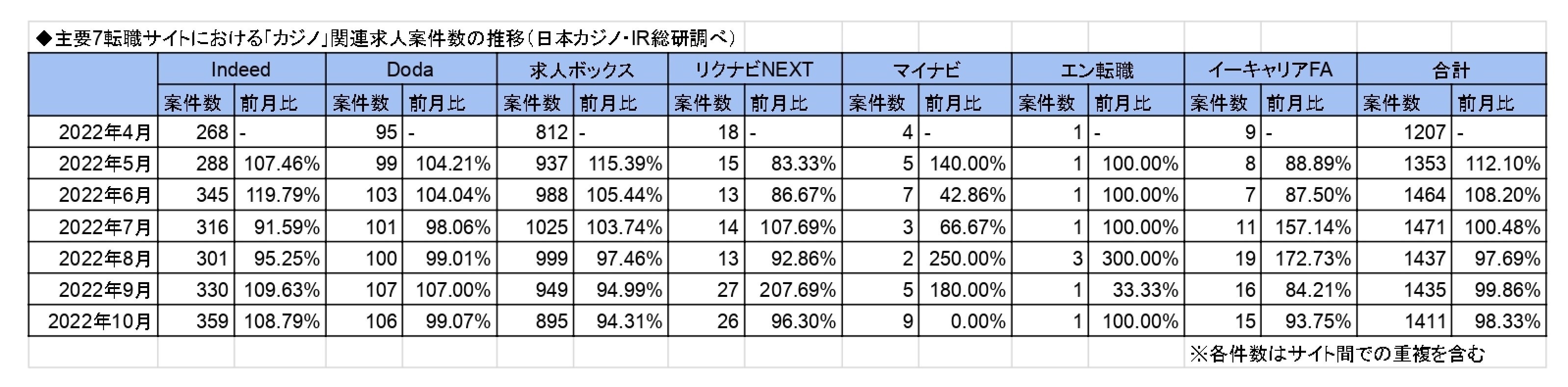 ■2022年10月時点での最新の「カジノ」関連の登録求人案件数と動向