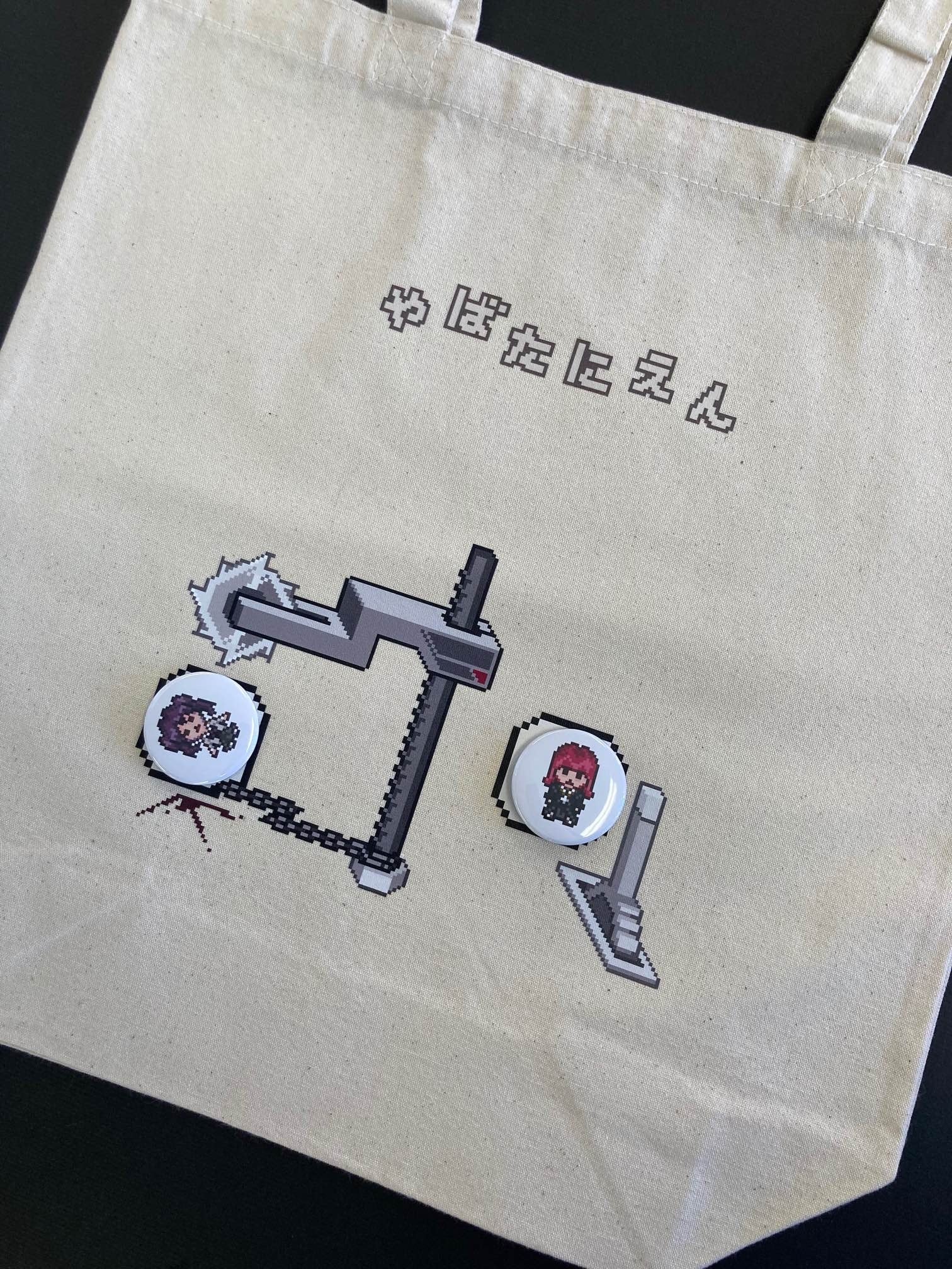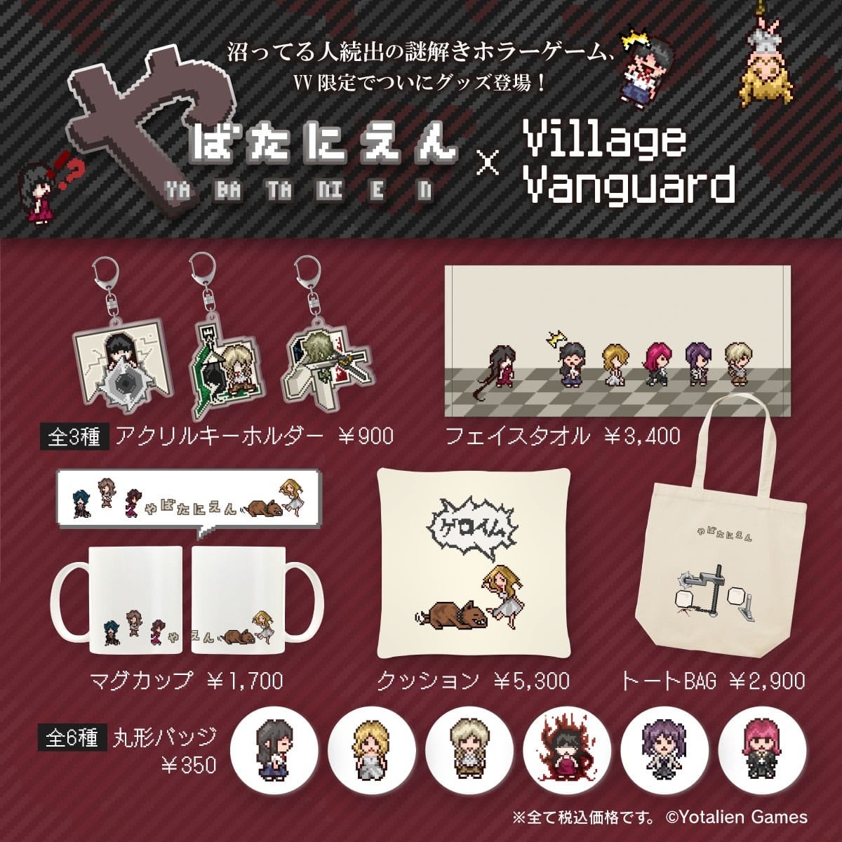 Yotalien Gamesプレゼンツ、囚われている女の子たちを謎解きしながら救出していくゲーム『やばたにえん』。ドッド絵の可愛いいイラストとは相反するホラー要素が大クセすぎてハマる人続出中!そんな今話題で人気のゲームから、ヴィレヴァンとのコラボグッズが発売決定!!トートバッグと缶バッジでゲームのシーンを再現できたり、ゲーム同様遊び心が効いてます!期間受注の限定販売ですので、この機会をお見逃しなく!!