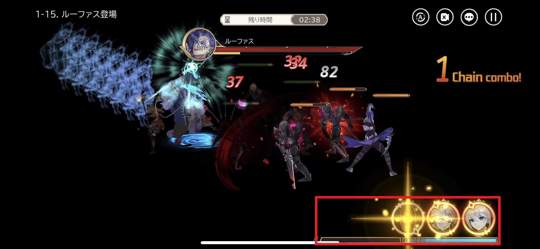 本作の最大の特長は、「チェイン」スキルです。「チェイン」スキルは、戦闘中に英雄の「アクティブ」スキルを使用して「チェインスキルエネルギー」を集めることで発動できます。
