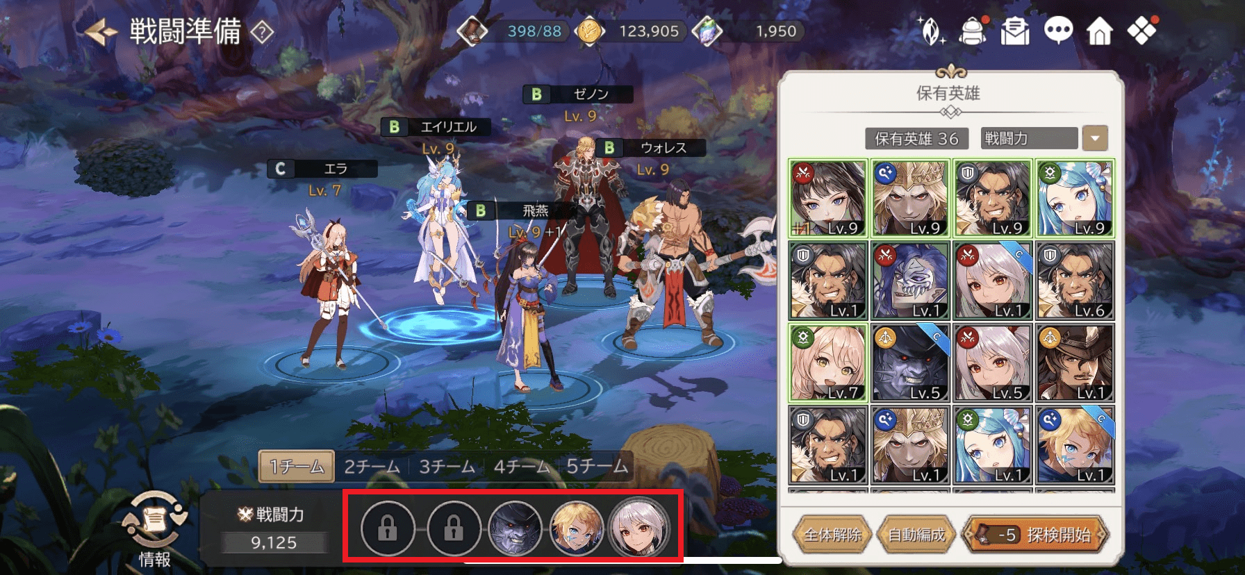 戦闘に参加するパーティーチームには最大5人の英雄を編成できますが、パーティーチームとは別に「チェイン」スキルのみを使用できる「チェインチーム」も同時に編成できます。「チェインチーム」には、パーティーチームに編成した英雄以外の英雄も追加できるので、これによって組める幅広い戦略が本作の醍醐味です。