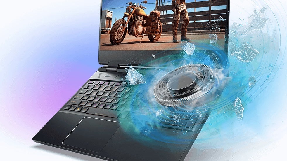 さらに、前世代に比べ最大約10%風量性能の向上を実現したAcer独自の冷却システム 第5世代AeroBlade(TM)(エアロブレード)3Dファン 1基を、通常のファン1基に加えて設置。生体工学に基づき、静かで高速に飛行できるフクロウの羽からヒントを得て作られた前世代を継承しつつ、0.1mmからさらに薄いわずか0.08mmというさらに薄く設計されたブレード89枚で構成された第5世代AeroBladeTM 3Dファン。ファンのエッジをギザギザ状にすることで風量を増加させ、静音性を高めつつキーボード周辺の熱を効率的に排除します。加えて、CPUとサーマルモジュールの間に、液体金属グリスを採用。これにより、より効率的に熱を逃がし、CPUの性能をさらに最適化します。