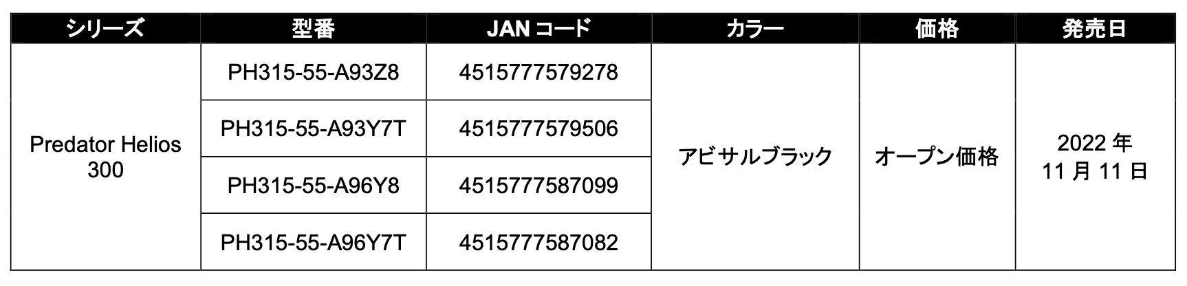Predator Helios 300 「PH315-55-A93Z8」「PH315-55-A93Y7T」「PH315-55-A96Y8」「PH315-55-A96Y7T」