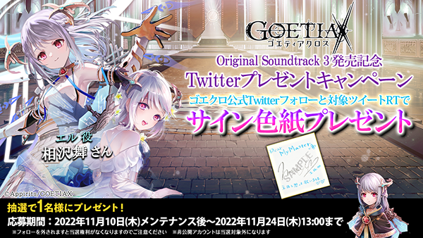 「ゴエティアクロス Original Soundtrack 3」発売を記念して、「エル」役の相沢舞さんの直筆サイン色紙を抽選で1名様にプレゼントいたします。
