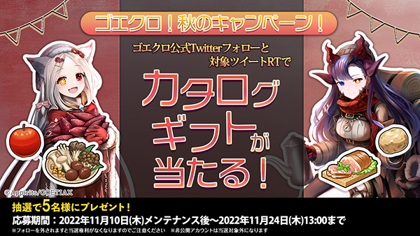 株式会社アピリッツ(本社:東京都渋谷区、代表取締役社長執行役員CEO:和田 順児)が開発・運営するスマートフォンアプリ・ブラウザゲーム・PlayStation®4/PlayStation®5版『ゴエティアクロス』は、2022年11月10日より、ユーザーのみなさまに秋を楽しんでいただくべく、さまざまなキャンペーンをご用意しました。秋の装いをした魔神の追加や、秋のグルメが本当に当たるプレゼントキャンペーンを行います。