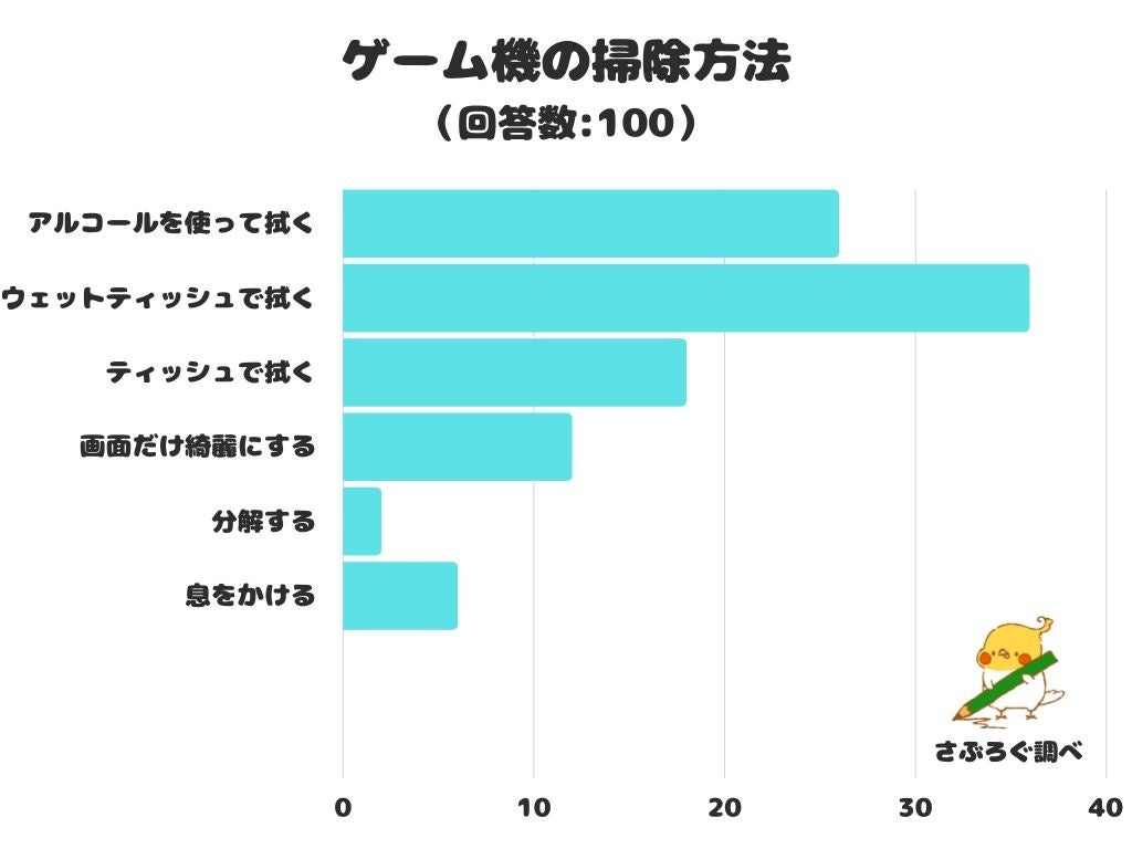 ゲーム機の掃除方法をアンケートにて調査したところ、1位は「ウェットティッシュで拭く」でした。