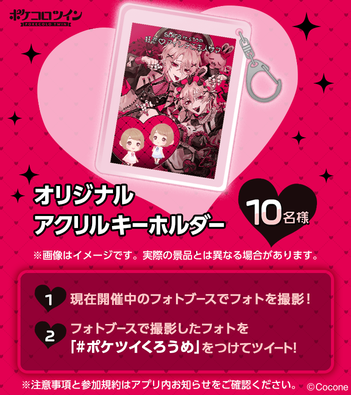 アプリ内の指定フォトブースで撮影したスクリーンショットを、指定ハッシュタグと合わせてTwitterに投稿すると応募完了。投稿画像をそのまま用いた当選者だけのオリジナルアクリルキーホルダーを、抽選で10名様にプレゼントします。詳細はアプリ内のお知らせをご参照ください。