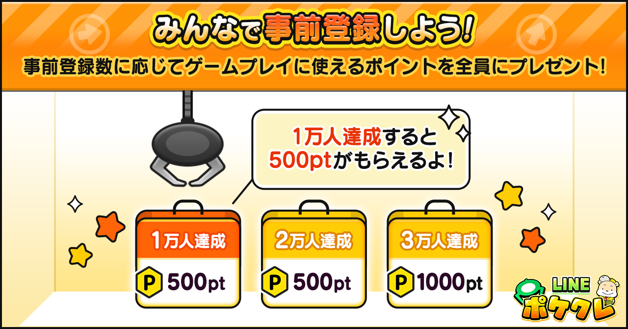 事前登録期間中、下記の事前登録サイトより、「LINE ポケクレ」のLINE公式アカウント(LINE ID:@line_pokekure)または公式Twitter(@line_pokekure)のいずれかで事前登録をしていただいた方全員に達成した事前登録者数に応じて、ゲーム内で使えるポイントを正式サービス開始後にプレゼントいたします。